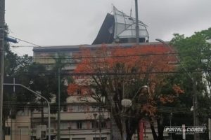 A estrutura metálica do prédio central de União da Vitória que foi danificada durante o temporal da madrugada do dia 17, começou a ser retirada na manhã desta sexta-feira,20.